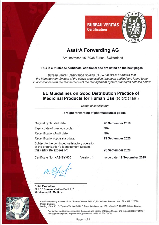 La certification a été effectuée par le Bureau Veritas Certification, l’un des leaders mondiaux dans le domaine des tests, contrôles et certifications. L’obtention de ce certificat est une garantie complémentaire de fiabilité des transports des marchandises de produits pharmaceutiques pour nos Clients. Par ailleurs, cela confirme que dans le processus du transport des marchandises de ce type AsstrA met en œuvre, à toutes les étapes du transport, les dernières technologies de contrôle et de communication d’informations. La certification des bonnes pratiques de distribution (BPD) est un système de principes et de directives pour l’industrie de la logistique ainsi que pour l’industrie pharmaceutique. Ces règles ont été décrites dans la Directive 94/C63/03 «Guidelines on Good Distribution Practice of medicinal products for human use».Zürich Versicherungs-Gesellschaft AG